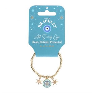 Radiate mystical style with this gold-tone beaded charm bracelet featuring an all seeing eye charm and two delicate star charms. Elasticated for a comfortable fit, it comes attached to a turquoise hanging tag with the words ‘Seen, Guided, Protected’- a thoughtful token for yourself or someone special. May contain traces of nickel and is made from alloy in accordance to REACH specification.