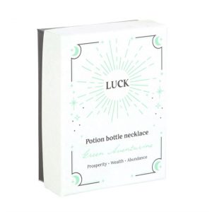 Give the gift of crystal magic with this miniature potion bottle necklace. With natural green aventurine crystal chips and a cork stopper, this necklace serves as a spellbinding accessory while attracting luck, wealth and prosperity. Presented in a matching gift box and perfect for that special witch in your life. Plastic bottle on a nickel-free stainless steel chain.