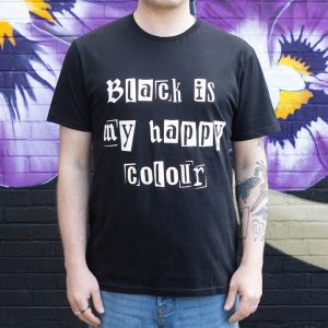 Show off your dark side in style with this unisex ‘Black Is My Happy Colour’ t-shirt, perfect for lovers of all things monochrome and moody. Featuring bold gothic-style text on classic black fabric, this tee is ideal for everyday wear, alternative events or a quirky gift for someone who always skips the pastels. 100% Cotton. Unisex Fit. Models in image are wearing size M.