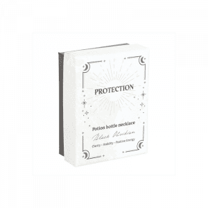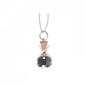 Give the gift of crystal magic with this miniature potion bottle necklace. With natural black obsidian chips and a cork stopper, this necklace serves as a spellbinding accessory while repelling negative energies and promoting stability. Presented in a matching gift box and perfect for that special witch in your life. Plastic bottle on a nickel-free stainless steel chain.
