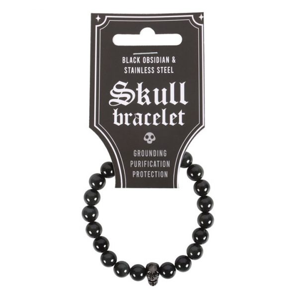 Experience the unique combination of mystique and style with this Black Obsidian Bead Bracelet, featuring an eye-catching black stainless steel skull charm. Designed with an elasticated band, this bracelet ensures a comfortable and flexible fit for any wrist. Black obsidian is often associated with protection, grounding, and the absorption of negative energy. This, paired with the skull symbol, conveys strength and resilience, embodying a bold statement of endurance and personal power. Jewellery is nickel free.