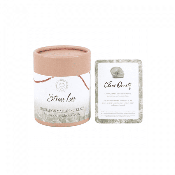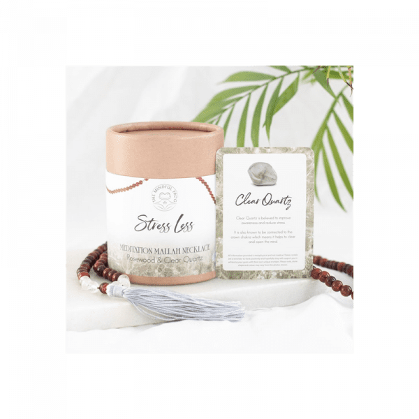 Crafted from rich, warm rosewood beads and intelaced with radiant Clear Quartz stones, this elegant necklace features 108 beads — a traditional number in Mallah necklaces, symbolizing spiritual journey and mindfulness — and is finished with a decorative tassel. The Clear Quartz, renowned for its cleansing and clarifying properties, is associated with all the chakras, particularly known for its ability to reduce stress and enhance mental clarity. It is believed to amplify positive energy and thought, encouraging calmness and serenity in the wearer. A Mallah, or Mala, necklace is a string of beads traditionally used in meditation and prayer in various spiritual practices including Buddhism and Hinduism. Each bead represents a repetition of a mantra or prayer, aiding in focus and spiritual contemplation. To use simply hold the necklace in one hand and move from bead to bead whilst focusing on mindful breathing and repeating an intention. The necklace can be worn throughout the day as a reminder of these intentions. Each Mallah Necklace is presented in a beautifully designed box, accompanied by a corresponding information card, making it an ideal and thoughtful gift for a loved one who seeking to alleviate stress, enhance mental clarity, and promote inner peace.