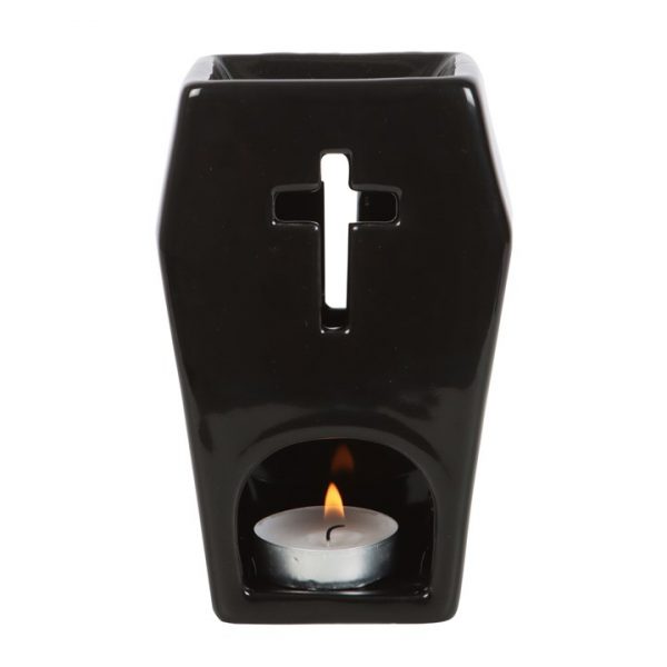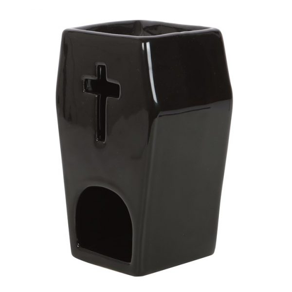 This unique coffin oil burner is perfect for those who appreciate gothic style and unconventional decor. When a lit tealight is placed inside, the cut out cross design is illuminated, casting ambient light and shadows around the room. A great statement piece for the home.