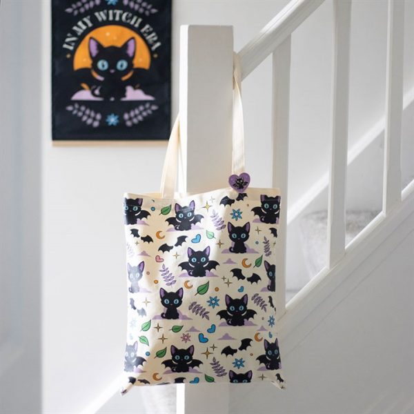 Carry your essentials in spooky style with this polycotton tote bag featuring an all-over print of playful black cats, bat wings, stars, and moons. Includes a coordinating enamel pin, making it an ideal gift for gothic and feline lovers alike. 95% polyester, 5% cotton.