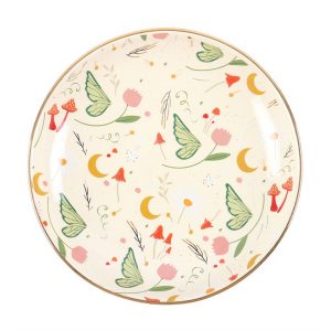 Keep jewellery and little treasures safe in this round ceramic trinket dish decorated with a whimsical garden fairy print. Ideal for adding a touch of forest magic to dressing tables or bedside storage.