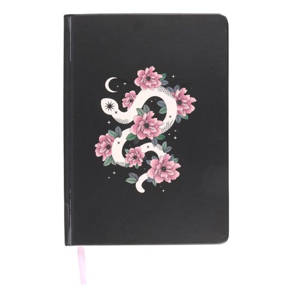 This lined notebook is perfect for keeping deep thoughts, notes and quick reminders. Featuring a curled, white snake and soft pink flower design, it makes a beautiful gift for those who appreciate both strength and softness. 100 sheets / 200 lined pages. Ribbon marker.