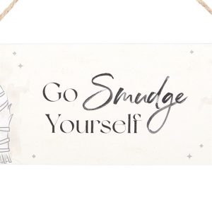 Add a dash of humour and a touch of charm to home and office surroundings with our MDF Hanging Sign with a Rope Hanger, featuring the fun phrase, “Go smudge yourself” and an illustration of smudge sticks.