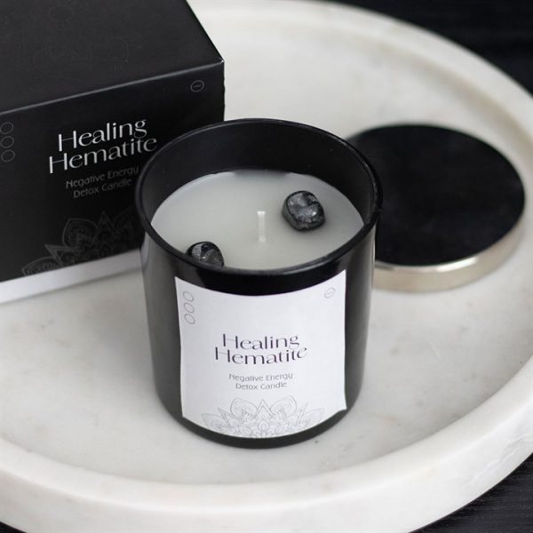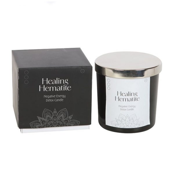 Detoxify negative energies with this healing hematite candle. Infused with the grounding properties of hematite, this unscented candle features polished gemstones to clear negativity and encourage positive energy. Encased in a black glass jar with a metal lid, packaged in a matching cardboard box ready for gifting. The crystal will release from the wax with use and can be later reused for a multitude of spiritual purposes. Approximate burn time of 18 hours.