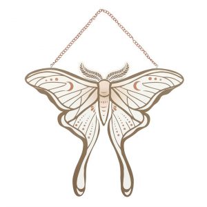 This elegant luna moth-shaped hanging sign adds whimsical charm to any room. A delicate symbol of transformation and mystery, its intricate wings represent timeless beauty. Hang in windows, on doors or across walls.
