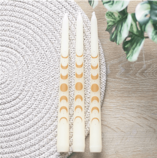 This pack of 3 white taper candles are perfect for adding final finishing touches to a table setting or adding decorative accents around the home. Featuring a subtle moon phases design, the candles offer the perfect blend of elegance and celestial symbolism and are a must-have for anyone seeking to add a unique touch to their living space.