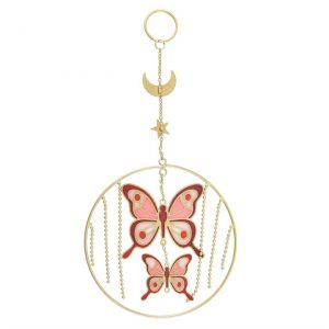 Bring whimsical charm to the home, garden, or sacred space with this pink butterfly hanging decoration. Crafted from gold-tone metal, this beautiful piece features a delicately shaped crescent moon and star, with two pink butterflies in the centre. A perfect little gift for anyone who adores a bit of celestial magic in their decor.
