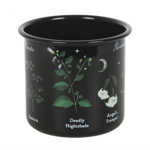 Start your day with a touch of gothic elegance with this black enamel-style mug, featuring an intricate design of poisonous plants. Adorned with poison ivy, hemlock, deadly nightshade, angel’s trumpet, poison oak, mistletoe, and foxglove, this mug adds a hint of darkness to your tea, coffee, or any brew of your choice. 500ml. Not suitable for microwave use. Handwash only.