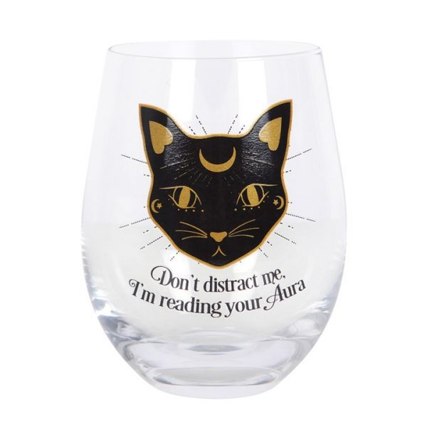 A mystical black cat adorns this stemless wine glass with cheeky ‘Don’t distract me, I’m reading your aura’ text. 500ml capacity. Hand wash only. Do not microwave.
