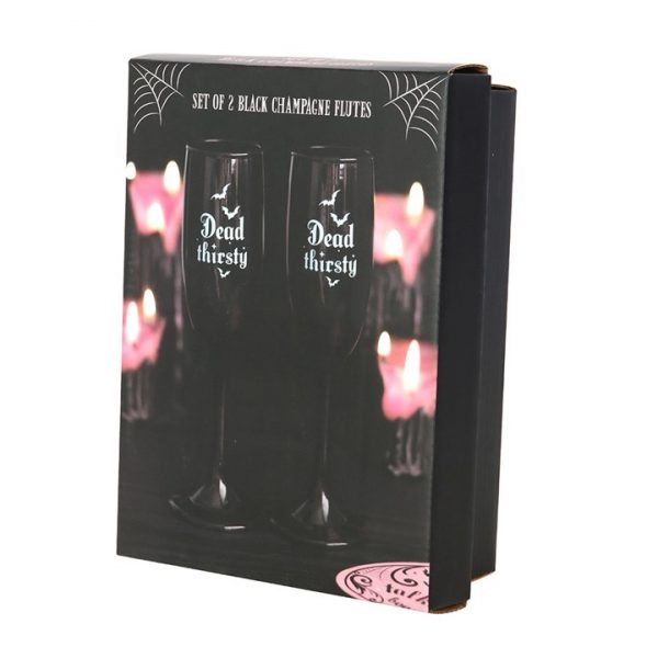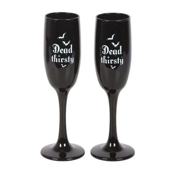 Celebrate with a gothic twist using this set of 2 ‘Dead Thirsty’ champagne flutes. Featuring a sleek black design, they’re perfect for spooky celebrations, weddings, or special occasions with a touch of flair. 300ml. Not suitable for microwave use. Handwash only.