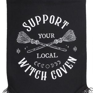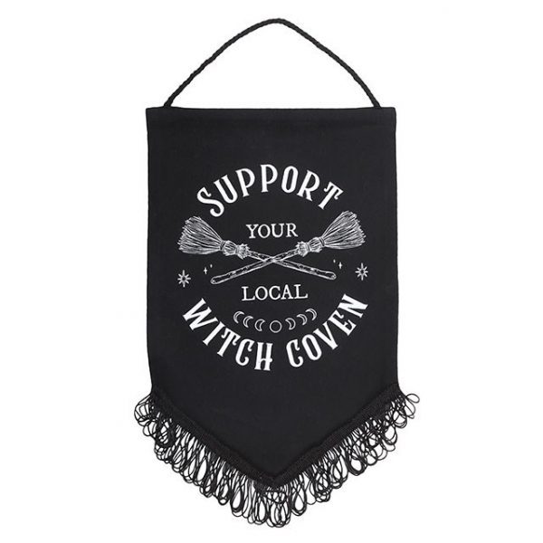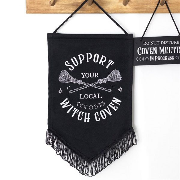 Make a statement with this gothic hanging fabric banner featuring the phrase ‘Support Your Local Witch Coven’ alongside a crossed broom design. Perfect for decorating altars, walls, or windows, it’s a fun piece for witches, practitioners, or lovers of all things magical.