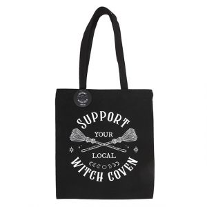Carry your spellbooks, groceries or daily essentials in witchy style with this black tote bag featuring the phrase ‘Support Your Local Witch Coven’ and a striking broomstick design. A practical and magical gift for modern mystics and coven queens on the go. Made from a durable polycotton blend.