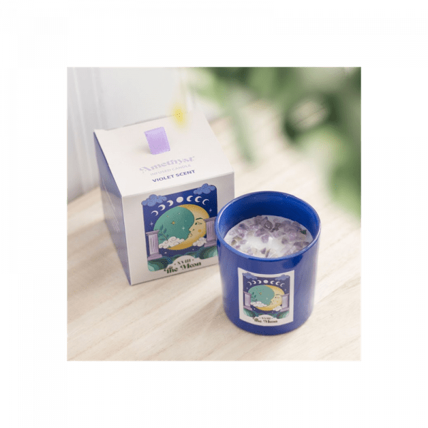 Relax and unwind with this violet fragranced candle inspired by ‘The Moon’ tarot card. This modern design features a blue glass holder accented by a scattering of amethyst crystal chips that can later be reused for a multitude of spiritual purposes. Acting as a natural tranquilizer, these amethyst chips will relieve stress, strain and anxiety. Paraffin wax. Crystals will release from wax with use. Approximate burn time of 25 hours. Please practice caution when burning and never leave lit candle unattended.