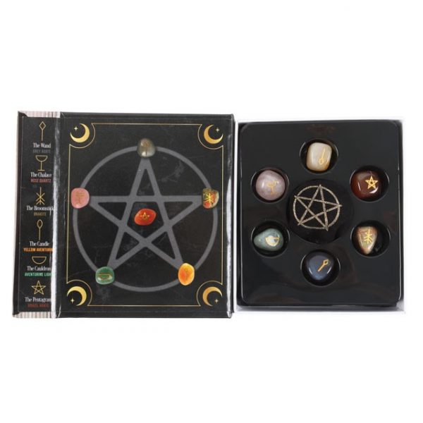 This witches guide to crystals gift set includes everything needed to cast stones for divination. Use the 6 included tumblestones and casting chart to amplify intentions and attract positivity. Crystals include The Candle (grey agate), The Chalice (rose quartz), The Broomstick (unakite), The Wand (yellow aventurine), The Cauldron (aventurine light), and The Pentagram (Brazil agate) with a velvet drawstring bag for safe keeping. Presented in an informational gift box. Due to their nature, size, shape and colour of stones will vary.
