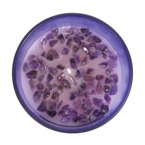 Realign the Third Eye chakra with this stunning Lavender fragranced candle. A purple frosted glass holder and metallic lid are accented by a scattering of amethyst crystal chips that can later be reused for a multitude of spiritual purposes. Paraffin wax. Approximate burn time of 25 hours. Please practice caution when burning and never leave lit candle unattended.