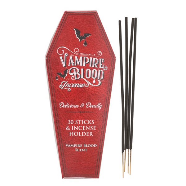 Step into the mysterious world of nocturnal allure with these vampire blood scented incense sticks – a captivating blend that transcends the ordinary. With 30 high-quality incense sticks in each pack you can elevate your ritual, meditation, or simply add an air of mysticism to your surroundings. Presented in a fitting coffin shaped box along with a coffin shaped incense stick holder, this pack makes a great gift for anyone wanting to embrace the dark elegance of vampire lore.