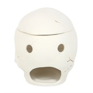 Add a hauntingly beautiful touch to the home with this oil burner and wax warmer, shaped like a weathered skull. This ceramic burner features a realistic, intricately detailed skull design which serves as a striking decor piece and a fragrance diffuser. Simply add your favourite essential oils or wax melts to the dish and light a tealight candle to enjoy the soothing aroma. Perfect for anyone who loves gothic and alternative decor pieces. Do not use more than one tealight and remove lid when in use. Never leave a lit burner unattended and allow to cool fully before handling