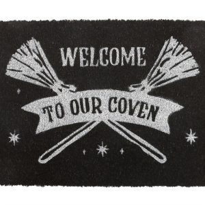 Invite fellow witches in style with this black coir doormat featuring silver broomsticks and the enchanting message, ‘Welcome to Our Coven’. A perfect addition to any witchy household, it’s ideal for celebrating sisterhood, spooky vibes, and magical gatherings. Design may fade in extreme weather. Suggested for sheltered and indoor use only.