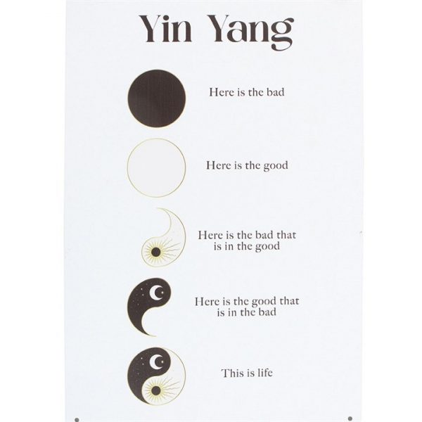 Use this hanging metal sign as a beautiful reminder to find the good in everything. Features a simple, modern design that illustrates the meaningful message behind the yin and yang symbol, used to represent balance.